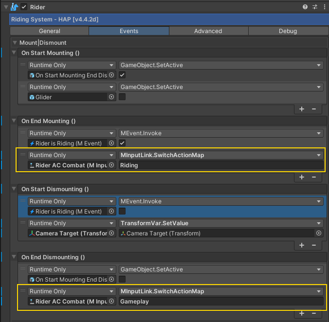 When the Rider Finish Dismounting the Action Map is changed back to "**Gameplay**" will be changed to Riding (Using the event MRider.OnDismountEnd()