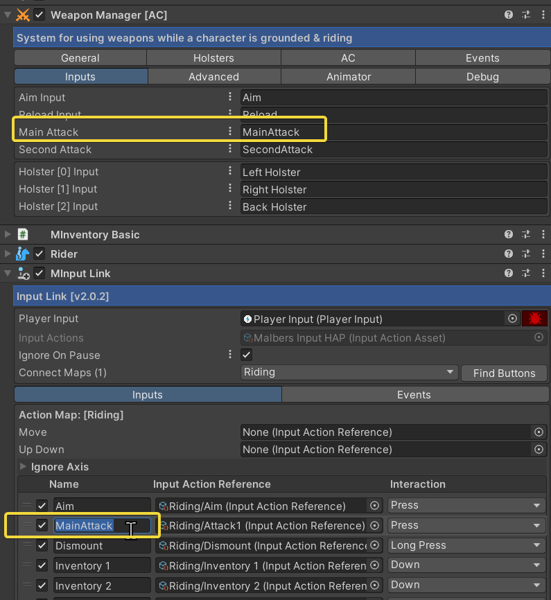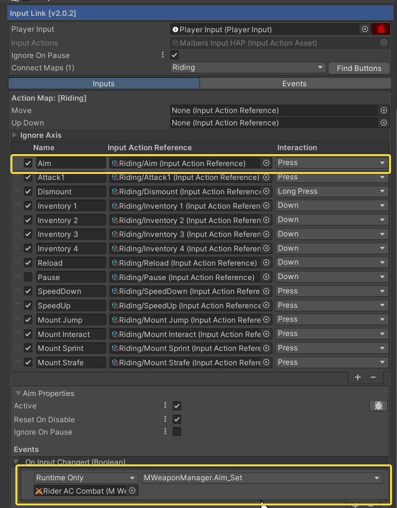 Here are the **Malbers Input HAP**, "**Riding" Map,** Input Action connections. Remember to check the **Interaction** on each Input Action. This will be the Inputs&#x20;