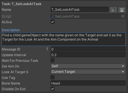 Find a child GameObject with the name given on the Target and set it as the Target for the Look At and the Aim Component on the Animal