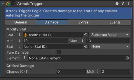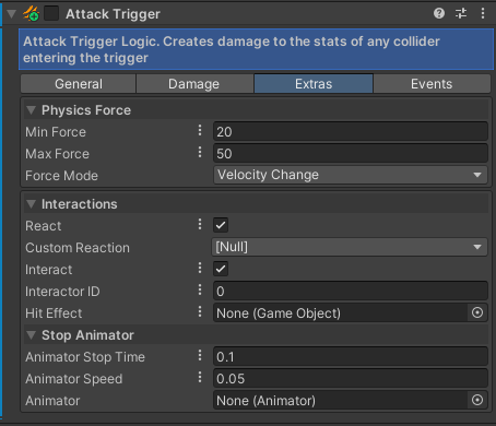 When a Damager registers a collider, it will apply a force to the attached rigidbody. You can set the Min and Max Force here.
